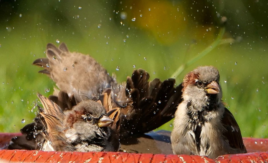 „An den heißen Tagen im August haben sich die Haussperlinge in der in meinem Garten aufgestellten Vogeltränke ein erfrischendes Bad gegönnt.“